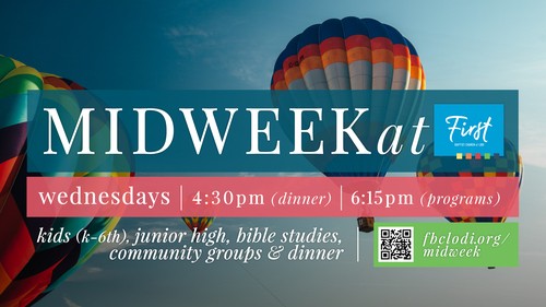 MidWeek at First is on Wednesday with dinner starting at 4:30pm and programs for adults, youth, and kids beginning at 6:15pm. Join us on Wednesday evenings to connect, grow, and find your fit here at First. There is a place for everyone!