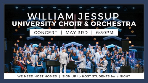 Mark your calendars! William Jessup University Choir & Orchestra will be coming May 3rd @ 6:30pm. We need your help though, students need a place to stay for the night. So please become a host home for Jessup Students for one night.